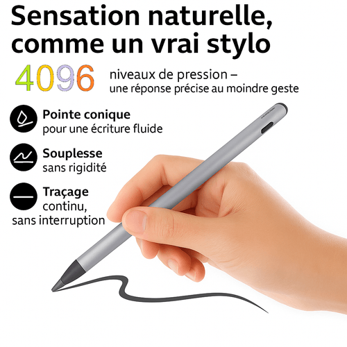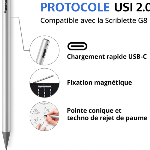 Le stylet, compatible avec la Scriblette G8 et la Boox Tab XC, se recharge rapidement via USB Type-C et offre jusqu'à 90 heures d'utilisation après 50 minutes de charge. Fabriqué en alliage d'aluminium, il est robuste et durable. Il intègre une technologie de rejet de la paume, permettant d'écrire ou dessiner tout en posant sa paume sur l'écran, et dispose d'un aimant pour l'attacher au côté droit de la scriblette. Sa pointe conique, résistante à l'usure et facilement remplaçable, garantit une écriture stable et fluide.
